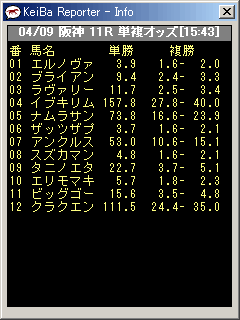 単勝、馬連オッズを表示できます。当然リアルタイムに更新表示を行います。