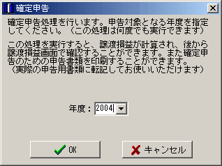 取引データが途中からしかない場合などは、過去の譲渡損益を登録することができます。 「上場株式等に係る譲渡損失の繰越控除」は2003年以降の損失を3年間を限度に繰り越せる優遇措置です。2003年以降の損失分はここで登録しておくことで、確定申告処理時に自動的に繰越控除が行われます。(取引データが全て揃っている場合は、過去の確定申告処理を行うことで、自動的に譲渡損益が算出され、この画面で確認することができます。) |