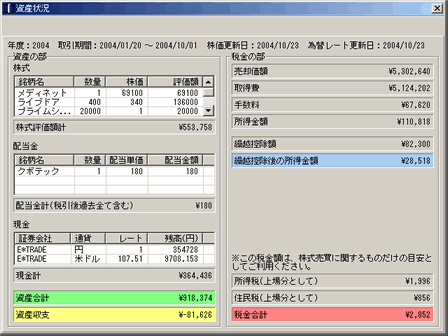 現在の資産を、株式、配当金、現金に分けて参照できます。また、税金の計算として、所得金額や所得税などの算出まで行います。