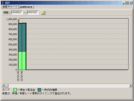 資産チャートおよび銘柄別収支をグラフで参照できます。株価更新のタイミングで資産が計上されますので、期間を指定して、資産の増減を把握できます。