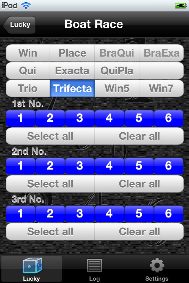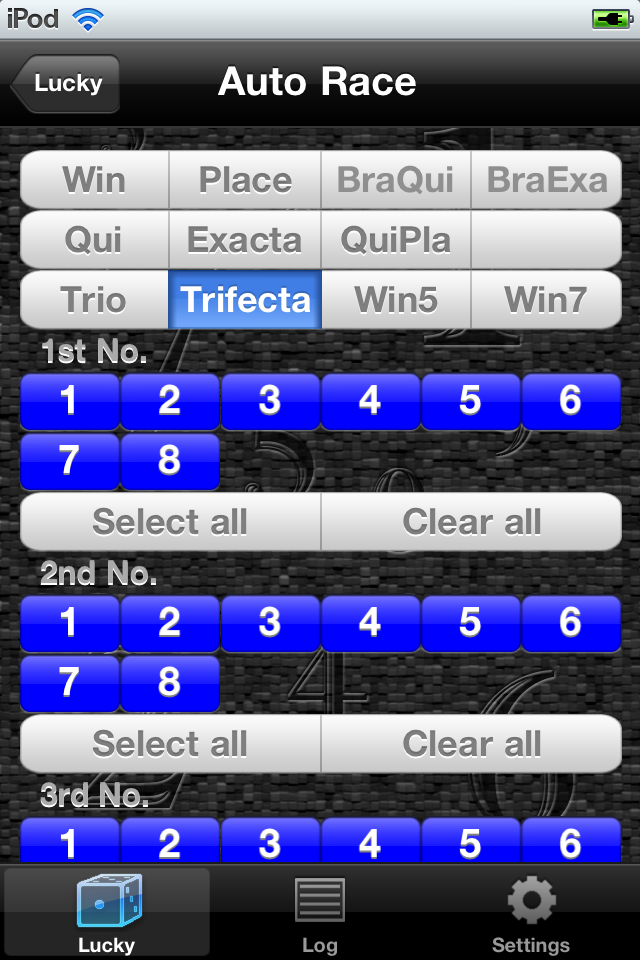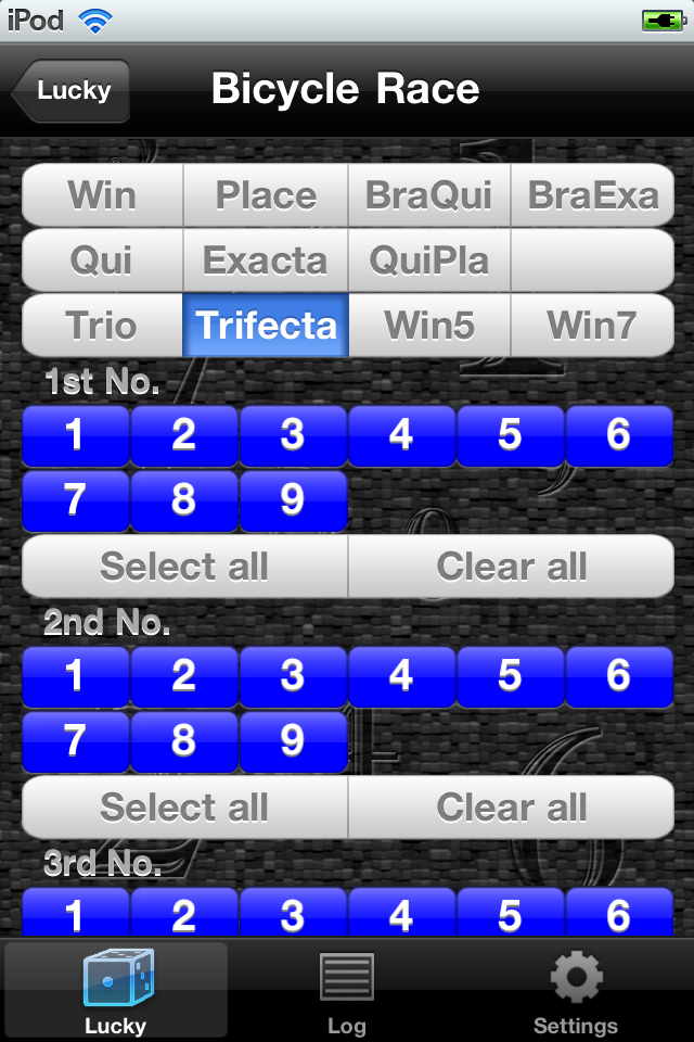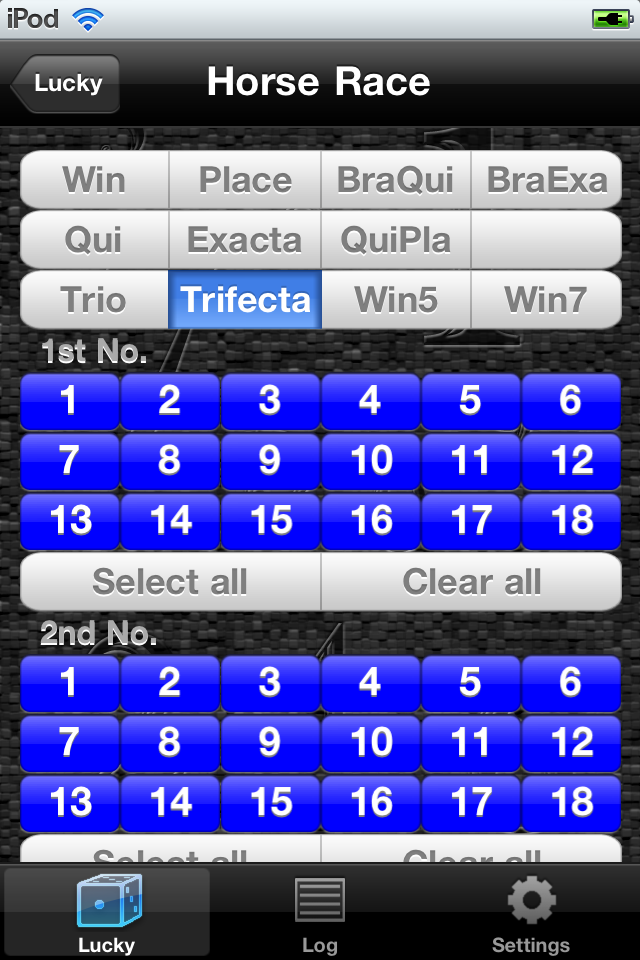 A kind: Win, Place, Bracket Quinella, Bracket Exacta, Quinella, Quinella Place, Exacta, Trio, Trifecta, Win5(Pick5), Win7(Pick7)