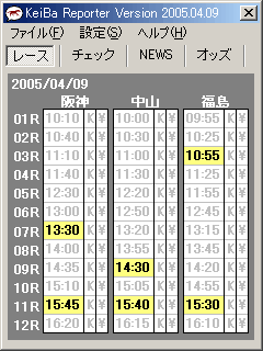 | KeiBa Reporter(以下KBR)は、レースの発走時刻や馬体重、払戻金などをリアルタイムにお知らせする、競馬リアルタイム報告ソフトウェアです。 チェックしたい競走馬、騎手なども登録でき、ニュースやオッズまでもリアルタイムに知ることができます。 環境設定により、お知らせ機能を細かく設定でき、メッセージの位置やサウンドのありなしも設定可能です。 |